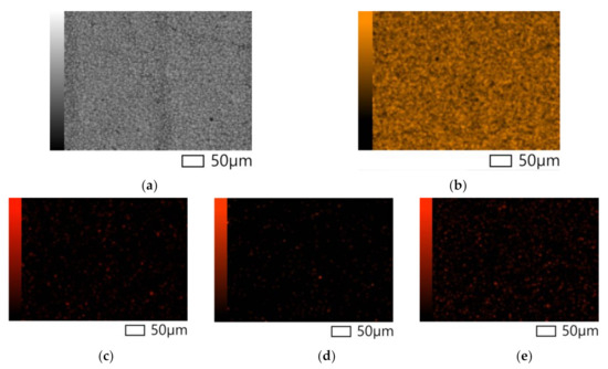 Analysis of the distribution of chemical elements on the surface of the sample undergoing laser cutting. (a) SEM photo of the sample, (b) Si surface distribution, (c) C surface distribution, (d) O surface distribution, and (e) N surface distribution.