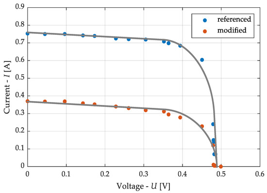 During the study, the I-U characteristics of modified samples were determined as in [39]. The I-U relationship for the reference cell was also determined as the comparative characteristics. The obtained I-U curve has been adjusted to several measured points, and graphs for exemplary monocrystalline cell (the great circle) are shown in Figure 8. The results from Figure 8 indicates that the laser cutting has no effect on the structure of the cells. Additionally, for comparison, the plot for modified and reference cells is also presented (reference cell).