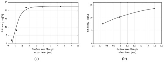 The surface area of the specimen S, the circumference of the laser cutting edge L, and their ratio S/L are shown in Table 4. In that table, the example values obtained during the research are presented. The plot of the efficiency against the S/L ratio for examined cells is shown in Figure 9.