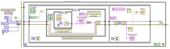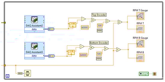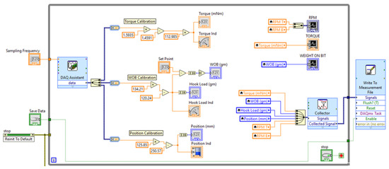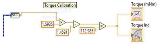 This loop reads the analog inputs on the USB-6210 and outputs the torque, weight on bit, and the position displacement on the HMI. This is done using the linear equations generated from the calibration of the sensor. The equations are programmed in the loop and the analog voltage values are used as input to output the corresponding physical quantities. For example, for the torque sensor, Equation (2) is implemented in the LabVIEW code, as shown in Figure 11. The loop runs at a sampling frequency set by the user and is also capable of saving the data points in the file. Figure 12 shows a screenshot of this loop.