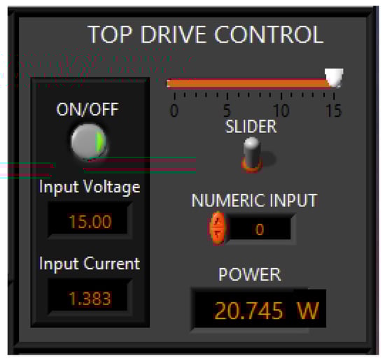 The HMI enables the user to control the RPM and the weight on bit. To control the RPM of the top drive, the user can change the value of the input voltage to the motor using a slider or a numeric input. The real-time power drawn by the motor is also displayed on the HMI. The RPM control panel is shown in Figure 17.