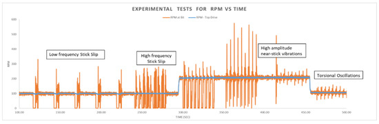 Figure 21 provides an example of the range of experimental tests possible with the setup. The blue line depicts the surface RPM of 100, whereas the orange line marks the RPM at the bit. The positive and negative fluctuation of bit RPM around 100 depicts a clear case of torsional vibrations. Stick-slip situations can be observed when the bit RPM drops to zero. Stick-slip vibrations are analyzed for both low and high frequency depending on the period of stick and slip.