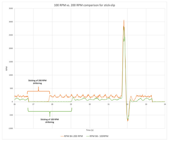 Comparison of 100 vs. 200 RPM string on stick-slip vibrations.