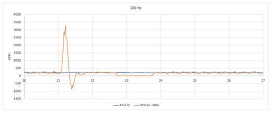 Most interestingly, the effect of sampling sizes in recognizing stick-slip vibrations is discussed in Figure 24. The figure is split into three plots of 1, 10, and 100 Hz. The surface RPM remains constant throughout the three plots with vast differences in bit RPM responses. The 1 Hz plot clearly misses the true signature of the stick-slip vibration with incomplete crests and troughs. When compared to the 10 Hz vibration data, the 1 Hz plot fails to capture the severity of the damaging peaks in vibration as well as the momentary sticking of the bit. The 10 Hz plot, on the other hand, highlights a momentary 1 s bit sticking phenomenon (22.8 s to 23.8 s) along with a negative peak in vibration. With an instantaneous bit RPM of 10 times the surface RPM, the 10 Hz plot gives insight into the actual peaks in vibrations observed. The data for 100 Hz is even more accurate and precise. While it performs better than both 1 and 10 Hz in capturing minute details like the string stabilization period after undergoing stick-slip vibrations, the stored data file also becomes substantially larger.