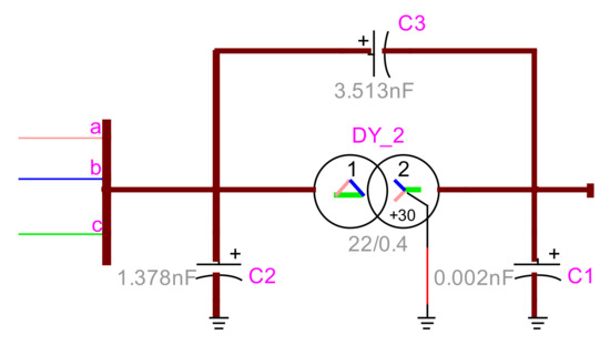 In this work, a Delta-Star () 22/0.4 kV transformer is modeled in the EMTP-RV environment, according to Cigre Guidelines [32]. The transformer comprises three basic building blocks as Figure 2 to present the 3-phase transformer model, see Figure 3. In high voltage studies, capacities on the MV side, LV side, and between MV and LV sides play a crucial role in obtaining more realistic results. The capacitor sizes are derived from the work in [33].