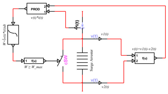Figure 5 presents the proposed fault model of the surge arrester. An energy-controlled switch in the EMTP-RV environment is used to model the behavior of the surge arrester when excess energy is pushed into it. In this figure, for didactic purposes, alongside, below, or on top of each block, the measured signals and the utilized functions to calculate the absorbed energy of surge arrester have been presented.