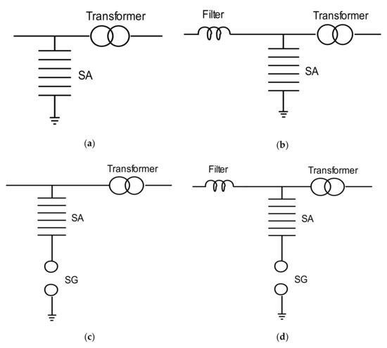 Figure 6 presents the arrangements of lightning protection devices for MV transformers. In Figure 6a, the transformer is protected by a sole surge arrester, while in Figure 6b, an inductor is used as the filter. The joint surge arrester and spark gap are presented in Figure 6c, and Figure 6d shows the filtered surge arrester and spark gap.