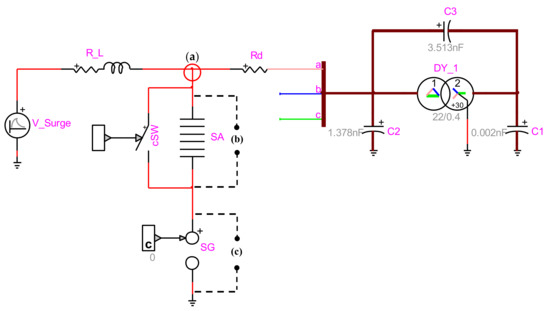 Figure 7 resents the configuration of the transformer protected by surge arrester, spark gap, or a series connection of both devices in the EMTP-RV software. In this configuration, for the sake of simplicity, only the indirect lightning impulses are applied on one terminal of the MV transformer, namely, terminal a, while all the measurements are carried out on the connection point of the protective devices, see point (a) in Figure 7. All the arrangements presented in Figure 6 can be made in the EMTP-RV model in Figure 7. Wires (b) and (c) are used for adding/eliminating the surge arrester and spark gap by disconnecting/connecting the two oval points of these wires, respectively. In this figure, the R in R_L stands for the internal resistance of the L filter. In this paper, for the sake of simplicity, an 1 internal resistance has been considered for all inductors. In case that there is no filter, a 1 resistor will be considered to take into account the resistance of the connecting wire between the lightning impulse and the transformer. The switch across the surge arrester is an energy-controlled switch, modeled in Section 2.4.2. Rd is the damping resistor, and in this paper, it is set to 200 .