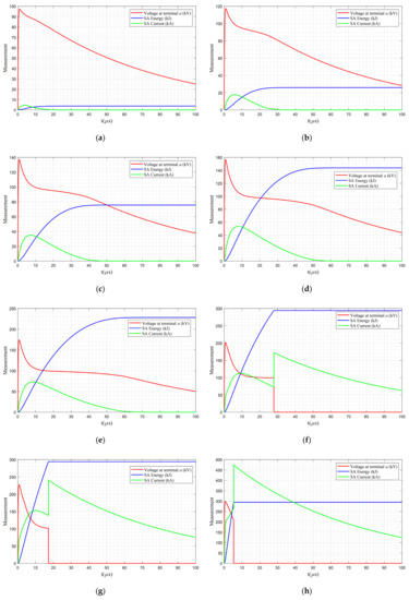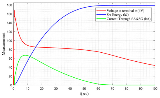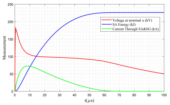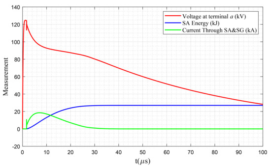 Figure 8a–h demonstrates the measured voltage at the MV side of the transformer (see point (a) in Figure 7), the absorbed energy by surge arrester, and the current flow through the surge arrester upon the ignition under different indirect lightning impulses. The time period in which the surge arrester is active can be verified by the current curve, i.e., whenever there is a current flow, the surge arrester is active, otherwise, it is an open circuit. As can be seen in Figure 8a, by applying a 100 kV lightning impulse, the surge arrester is active only for a short period of time while the current peak is about 5 kA. The energy absorbed by the surge arrester under this lightning impulse is ~4 kJ, which is well below its thermal energy absorption limit, 294 kJ; therefore, the surge arrester works properly, and no short circuit occurs. That is, under normal conditions, the switch remains open. Similarly, in Figure 8 b–e, the absorbed energy is below 294 kJ, and the surge arrester can effectively protect the transformer while not interrupting the service to the electricity consumers. In this figure, as the applied lightning impulse increases, the amplitude of current flow through the surge arrester increases, and consequently, the surge arrester absorbs a higher amount of energy. For example, in Figure 8b, compared with Figure 8a, increasing the lightning impulse by ~25 kV results in an ~12.5 kA increase in the current flow through the surge arrester while its absorbed energy faces a 21 kJ increase. Another observation from Figure 8a–e is that although the amplitude of the lightning impulse is increased by a step of 25 kV, the increases of the current and absorbed energy do not follow a linear pattern. This is mainly due to the nonlinear characteristic of metal oxide surge arresters [47]. As an instance, under the 200 kV lightning impulse, in Figure 8e, compared with the 175 kV lightning impulse, in Figure 8d, by increasing 12.5% in the lightning impulse, the absorbed energy is increased by ~56.8% (from 143.8 kJ to 228.31 kJ), while the operating duration and the peak current flow are increased by about 10 and 19.38 kA, respectively. The appropriate operation of the surge arrester continues until its absorbed energy exceeds the thermal absorption limit, as can be seen in Figure 8f–h where the surge arrester pushed into a failure. As can be seen from these figures, under such conditions a fault occurs, and the current flow through the surge arrester shows a considerable jump due to the proper functionality of the proposed energy-controlled switch under the faulty situation. When the surge arrester is short-circuited, the voltage at the transformer terminal reaches to zero. That is, continuous service to electricity consumers will be interrupted.