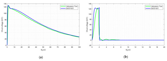 The validation is done by applying a nonstandard 125 kV overvoltage impulse on the transformer terminal at the presence of a spark gap. In this work, first, the method proposed by the Cigre Working Group 01 [48] is used to estimate the (), and according to the work in [35], if is large, then is considered to be lower than or equal to 1, then a trial and error method is used to find the best values for k and D that yields to a better agreement with the laboratory results. By using this approach, the following parameter have been obtained; kV, , and 0.01. Figure 10a depicts the applied laboratory impulse (the green curve) and the simulated impulse in EMTP-RV (the blue curve). Figure 10b compares the performances of the spark gap under the laboratory test and via the DE method. As can be seen from this figure, there is a good agreement between the laboratory test and the results obtained in EMTP-RV software. Interested readers may refer to the work in [49] for obtaining a complete report on the laboratory setup, supporting figures, as well as a wide range of experimental results at the presence of spark gap, while more information regarding the applied impulses and the validation of the spark gap can be found in [33,50].