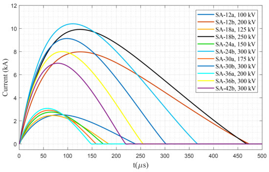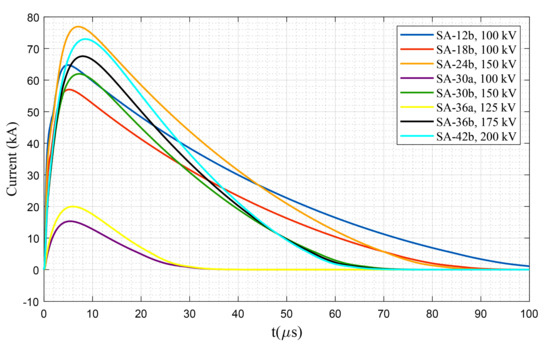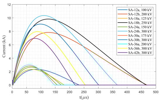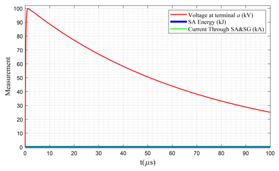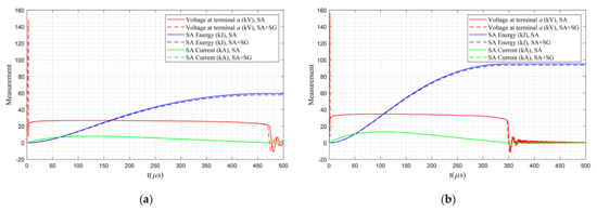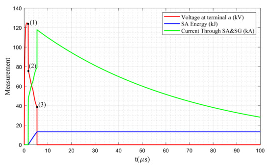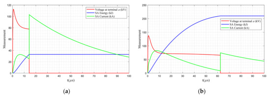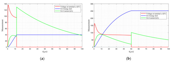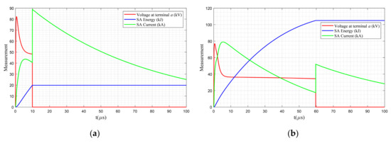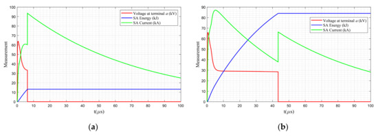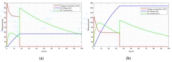 In Figure 11a, the surge arrester SA-12a is used, which has a lower thermal absorption capacity than the SA-12b; in Figure 11b, a 100 kV lightning impulse results in a fault within ~6.1 , while such failure for the SA-12b occurs under the 125 kV lightning impulse and within ~43.9 . Therefore, the surge arrester SA-12b can adequately protect the transformer against the 100 kV lightning impulses while guaranteeing the continuous service to the electricity consumers.