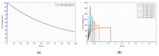 (a) Applied nonstandard 125 kV lightning impulse. (b) Measured overvoltage stress at the presence of spark gap [33].