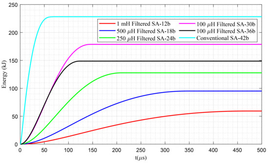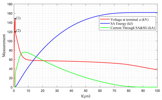 In order to see the details of surge arrester performance enhancement, as an instance, the absorbed energy by surge arrester SA-12b under the 125 kV lightning impulse (as the risky overvoltage stress for transformers [38,39]) for different inductor sizes are compared in Figure 25. As can be seen from this figure, by using a conventional surge arrester (red curve), a voltage sag occurs at the beginning of lightning. After attenuating the voltage to ~30 kV, the surge arrester, due to absorbing more energy than its thermal absorption limit, is pushed into a failure and acts as a short circuit. Then, although even the overvoltage peak is much lower than 125 kV (~66 kV), all in all, the surge arrester is not suitable for guaranteeing a continuous service to consumers. On the other hand, it can be seen that when the surge arrester is equipped with an inductor, this newly formed filtered surge arrester provides proper protection against the 125 kV lightning surge. That is, first, the voltage sag is eliminated, and second, there will be no interruption in the supply service. Moreover, it can be deduced that by increasing the size of the filter, the peaks of the measured voltages are decreased, while the operating times of surge arrester are increased. For example, by increasing the inductor size from 100 to 250 , the peak voltage is decreased from 28.72 kV to 27.60 kV, while the operating time is increased from ~195 to ~243 .