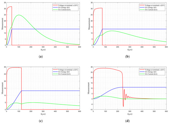 Moreover, Figure 8f–h shows that the higher the lightning impulse is the faster the thermal absorption limit is reached and the surge arrester fault occurs such that under the 500 kV lightning impulse, Figure 8h, the surge arrester cannot even withstand to decrease the overvoltage amplitude below the risky overvoltage level, 125 kV [38,39].