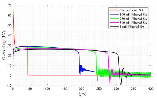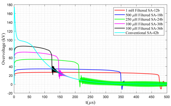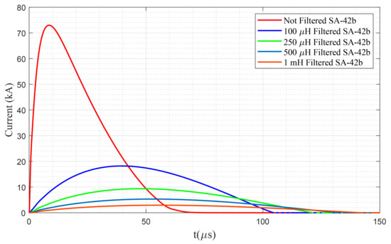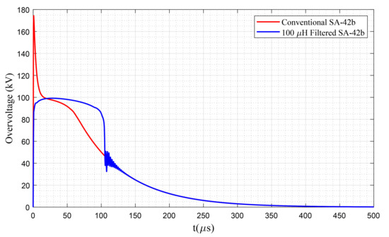 In order to show the impact of different filters on di/dt of the surge arrester, SA-42b is tested under the 200 kV impulse (the impulse that can be handled via the conventional SA-42b, see Table 3), and results are depicted in Figure 30. As can be seen from this figure, the current flow through the surge arrester without any filter reached to about 73 kA with a di/dt of about 8 kA/, but after considering the 100 filter, the current has been limited to ~18 kA (i.e., an ~75.3% decrement) and the di/dt has been decreased to ~0.42 kA/. By applying the 250 , 500 , and 1 mH filters, the current decrease to about 9.8 kA, 5.8 kA, and 2.5 kA, respectively, with the di/dt of about 0.19 kA/, 0.09 kA/, and 0.04 kA/. Results confirm the superiority of using filtered surge arrester over the conventional one.