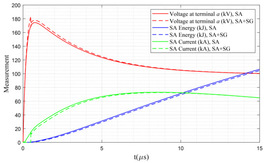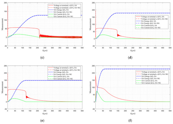 Figure 31a–f provides a comparison among the protection mechanisms of the filtered surge arrester and joint filtered surge arrester and spark gap against a 200 kV lightning impulse. In this figure, the solid curves present the measurements made at the presence of filtered surge arresters, while the dashed curves stand for the measurements made at the presence of a filtered surge arrester and spark gap. Note that Figure 31f presents the protection mechanisms of protecting devices with conventional (non-filtered) surge arrester SA-42b. As can be seen from the configurations in which a filter has been used (Figure 31a–e), the main difference between the protection mechanisms of filtered surge arrester (solid curve) and the joint filtered surge arrester and spark gap (dashed curve) is the voltage sag resulted at the beginning of lightning due to triggering the spark gap, while the surge arrester alone does not cause such voltage sags. However, the spark has a small impact on decreasing the absorbed energy by surge arrester that increases the functionality margin against higher lightning impulses, although negligible. As an instance, in Figure 31a, the energy pushed into the surge arrester when no spark gap is considered is ~59.33 kJ, while for the case with the spark gap, the energy is decreased to ~57.65 kJ, which shows 2.83% enhancement. Moreover, for lower rating surge arresters connected with spark gaps, the operating time is a bit less than the time required by using only surge arresters (see Figure 31a–c). Such a situation is not valid for higher rating surge arresters (see Figure 31d–f).