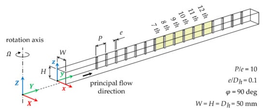 The heat-transfer measurements by means of the two LCT approaches have been performed on a simplification of an internal cooling passage of a turbine blade. The channel geometry and its spatial orientation are depicted in Figure 1. The channel model has a scale factor of about 20 allowing us to perform spatially detailed HTC distributions. The resulting channel length is 1000 mm with a constant square cross-section of 50 50 mm that corresponds to a hydraulic diameter equal to 50 mm. On one side, 16 squared ribs are installed with the angle of attack of 90 degrees with respect to the main channel axis (i.e., the principal flow direction), the blockage ratio is 0.1, and the rib pitch-to-height ratio is 10. The first 200 mm at the channel inlet are kept smooth. The reference frame relative to the channel has the x-axis perpendicular to the ribbed wall, the y-axis towards the radial direction, and the z-axis parallel to the ribs. The model spins around the Z-axis of the global reference frame with angular velocity .