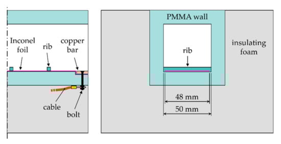 Figure 3 provides a schematic representation of the test article employed in the steady-state LCT experiments. The channel is formed by plexyglass (PMMA) walls of 12 mm thickness. A 25 μm thick Inconel 665 alloy foil provides the required heat flux by Joule effect onto the entire ribbed area. The foil has a width of 48 mm and is attached by means of an adhesive layer, then the ribs (as well made of PMMA) are glued on the Inconel surface. Copper bars strongly soldered at both ends of the foil allow providing a uniform power supply to it. The channel is externally covered by a 50 mm layer of polyurethane foam to reduce the conductive heat losses. Two K-type thermocouples monitor the outer surface temperature of the insulating coat to provide the information that is necessary for heat losses estimation. The inlet and outlet temperature conditions of the flow are taken by two K-type thermocouples, which are installed in the centre of the respective channel section. Matt black paint SPB100 Hallcrest is sprayed on the ribbed and sidewalls to avoid annoying reflections and acting as a background to enhance the colours of the liquid crystals. Then, the R35C7W Hallcrest wide-banded LC are applied only on the investigated surface, according to the procedure of surface preparation exposed in []. The selected LC present a nominal starting temperature of 35 °C and a colour bandwidth of 7 °C.