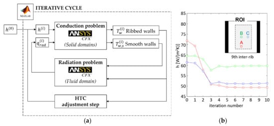 At the first iteration, an attempt distribution of the convective heat transfer is estimated from Equation (3) by neglecting the heat losses, and it is used as a boundary condition for the conductive model. The latter computes the inner wall temperature distributions, which in turn, are the boundary conditions for the radiative model. Meanwhile, the temperature map of the ribbed surface and experimental one from the steady-state LCT are compared. The iterative loop continuously updates the HTC distribution by computing Equation (4) and runs the numerical simulations until the measured and calculated temperatures match.