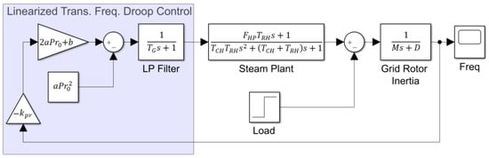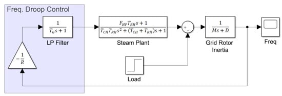 In the traditional automatic generation control, the grid frequency is mainly regulated via a control scheme called frequency droop control []. In this scheme, as shown in Figure 1, the frequency is measured and scaled by a negative feedback gain called the droop constant. The scaled signal is then fed into a low-pass filter to mitigate the feedback noise. The filtered signal is then used as the reference position for the generator’s input valve to control the power output.