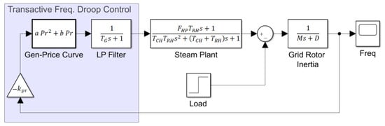 To demonstrate the stability of the system, we adopt the parameter values for the steam generator and the grid frequency dynamics from Reference []. To assign a reasonable value for the frequency-price gain, , we match the transactive and the traditional droop controllers at the nominal price of = 0 p.u. This would result in the equivalent value of . Table 1 summarizes the parameter values adopted from Reference [], as well as those obtained from the generation-price function, and the resulting equivalent value.