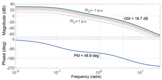 Bode plot of the loop gain transfer functions of the linearized system in the price range of [−1, 1] p.u., indicating ample stability margins in the worst-case scenario.