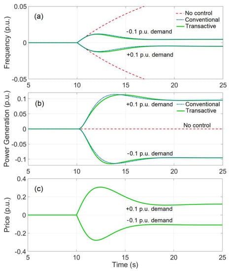 Responses of the conventional and transactive frequency droop controllers to ±10% step change in demand: (a) Frequency, (b) power generation, and (c) transactive controller’s price response.
