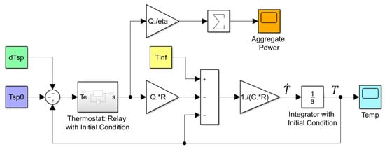 In this study, we used Simulink to simulate the aggregate AC system model, as shown in Figure 7. All the parameters and signals have been vectorized to facilitate the model development and simulation. The AC temperatures are initialized inside the integrator, and a custom relay function is developed based on Equation (7) to allow arbitrary initial values for the switching state, s. The parameters of the system are adopted from Reference [] and given in Table 2. The table also contains the relative standard deviation of the parameters used to create a realistic population from normal (Gaussian) distributions.