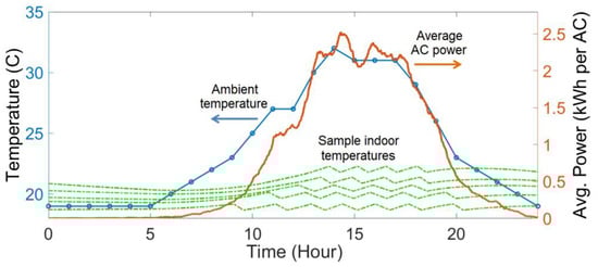 Figure 8 shows the simulation result, with the ambient temperature, aggregate AC power, and 5 sample indoor temperature trajectories with different setpoint values being plotted. As can be seen, the average AC power follows the ambient temperature with a small time delay. During peak time, the average AC power reaches to around 45% of the maximum potential power the ACs can demand (2.5 kW vs. 5.6 kW max power per AC unit). This is because of the fact that the loads turn on and off at different times due to different initial conditions and thermal properties, as seen from the sample indoor trajectories. From the individual temperature trajectories, we can see that the lower the setpoint temperature, the higher the AC activity.