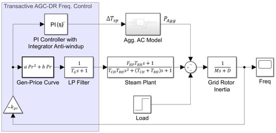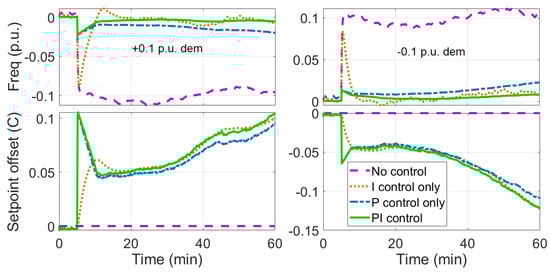 The block diagram of the integrated demand-side and generation-side transactive frequency control system is shown in Figure 9. The PI controller receives the price signal and determines the change in the setpoint temperature of the TCLs according to Equation (11). In practice, the PI controller computations can be done within each thermostat through sensing the frequency, conversion to price, and then adjustment of the setpoint temperature.