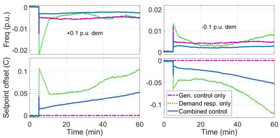 Integrated generation-side and TCL-based transactive frequency control simulation for ±10% step change in load: 10% load increase (left), and 10% load cut (right).