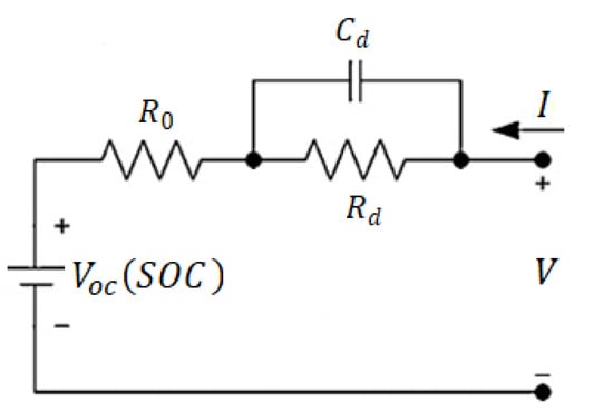 where SOC stands for the battery state-of-charge, represents coulombic efficiency, is the charge capacity, is the charging current, represents the diffusion voltage, and and are the diffusion resistance and capacitance, respectively. The battery terminal voltage is given by: