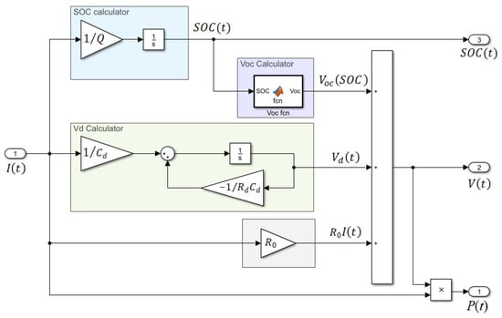 The block diagram of the system is shown in Figure 13. A function block is used to create the nonlinear SOC-dependent open-circuit voltage relation. The battery power is calculated by multiplying the input current by the terminal voltage as shown in the diagram.