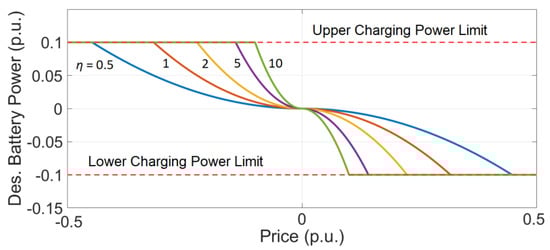 where is a constant positive parameter for tuning the battery system’s sensitivity to the price signal. Figure 14 demonstrates this function for the different values of in the range of 0.5 to 10. Based on this relation, the battery discharges to the grid when the price rises above the nominal value (i.e., 0 p.u.) and charges from the grid when the price drops below the nominal value. The battery charging/discharging power increases quadratically as the price deviates from zero until it hits the maximum limit, beyond which the desired power remains constant. There is a nearly flat region around the nominal price, where the battery’s activity is marginalized. The larger , the narrower the flat region and the higher the sensitivity of the desired power to the price signal.