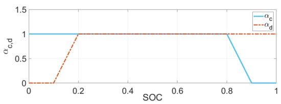 where and are the lower and upper SOC limits, respectively, and determines the SOC range within which the battery power slows down near the lower or upper limit. Figure 15 shows the shape of and for the admissible SOC range of 0.1–0.9 and value of 0.1.