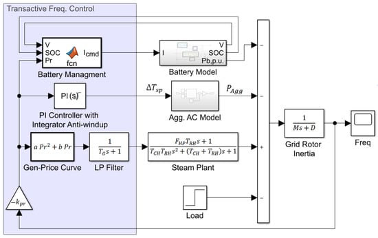 In this paper, a transactive controller was proposed to simultaneously manage grid frequency and demand response resources via a universal electricity price signal. The price can be related to grid frequency and measured locally by the generators and loads, or broadcast via a communication infrastructure to all entities. A frequency droop controller was adopted from the conventional automatic generation control framework to build a simulation model. To incorporate a demand response capacity, a population of thermostatically controlled air conditioning (AC) loads was added to the grid. The loads were assumed to have flexible setpoint temperatures that can be adjusted continuously based on the price signal. A PI controller was used to control the AC system’s response. To capture energy arbitrage dynamics on the grid, an equivalent-circuit battery model was adopted. A nonlinear control scheme was developed for the battery to provide appropriate charging and discharging cycles in accordance with the price signal.