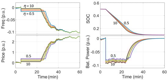 The first simulation of this section looks into the grid’s frequency when only the battery is responsible for the grid’s frequency regulation. The generator is disconnected from the grid, and the AC system’s demand response controller is turned off, making it a passive load on the grid. The battery’s initial SOC for this simulation is set to 0.5. A 10% step load is applied after 5 minutes. The simulation results are shown in Figure 17 for the different values of parameter . As can be seen, the battery is able to maintain the grid frequency near the nominal value as long as the SOC is above 0.2. Once the SOC drops in the δ range, i.e., below 0.2, after about 20 minutes, the battery slows down discharging, and the frequency is dropped to near the uncontrolled level of -0.1 p.u. when SOC reaches the lower limit of 0.1. The larger the value of , the more aggressive the battery discharging, and the higher the initial frequency control performance. However, the battery provides a shorter response due to capacity limitation. In practice, this gain must be tuned to provide the maximum economic return from the daily price fluctuations on the grid.