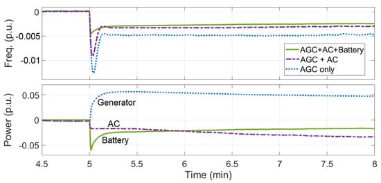 The second simulation of this section explores the integrated system when all the components discussed previously are actively responding to the electricity price signal. Figure 18 compares the three cases of AGC only, AGC plus AC demand response, and all the three systems together, for the case of 10% step increase in the load. As can be seen, the addition of battery provides a significant improvement to the grid’s transient response. This is mainly due to the battery’s instantaneous response to price variation, which prevents the frequency from dipping significantly. There is a small improvement in the steady-state response of the system as well. However, the battery’s share of steady-state power contribution is only about 15%, which is the smallest among the three systems for this particular simulation.