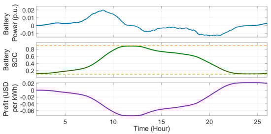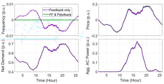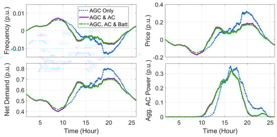 To start the simulation from an equilibrium condition and near the nominal price, we set the simulation start time to 2 a.m., where the net demand (grid demand minus renewable power) is near its mid-point. The battery control parameter is tuned in such a way that the battery’s main charging and discharging events occur during price valley and peak periods. To achieve this goal, we use two different values for , one for charging ( = 0.85) and another for discharging ( = 0.45), obtained based on trial and error for this particular simulation. The AC demand response controller’s parameters are kept the same as before ( = 0.2 and = 0.0002) since they result in a reasonable setpoint temperature variation, i.e., around 1 °C during the simulation period.