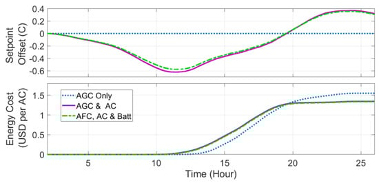 To further demonstrate the AC system’s demand response, Figure 21 shows the setpoint offset for the 3 different scenarios. As can be seen, the net setpoint temperature change for the duration of the simulation is around 1 °C, which indicates a small but manageable compromise in the building occupants’ comfort as a result of the demand response operation. In return, the average AC energy cost is reduced by 13% as also shown in Figure 21. The addition of the battery further reduces the energy cost by 0.5% for the ACs.