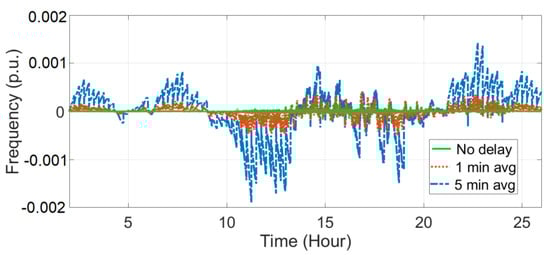 Since the feedforward price is dependent on the net grid demand, there may be a measurement and communication time delay. Besides, the price signal may be broadcast at much slower intervals than the frequency control loop. Therefore, it is reasonable to investigate the impacts of such time delays on the grid frequency. Figure 24 compares the three levels of broadcast delays on the frequency: No time delay; 1-min demand averaging and broadcast intervals; and 5-min intervals. The time delay involved in averaging and broadcast is clearly creating chatter in the frequency signal. The longer the delay, the larger is the chatter. Nonetheless, the maximum frequency deviation remains within a small range, i.e., around 0.05% and 0.2% with 1 min and 5 min broadcast intervals, respectively. Without any feedforward price information, the maximum frequency deviation is around 0.7% as depicted in Figure 23.