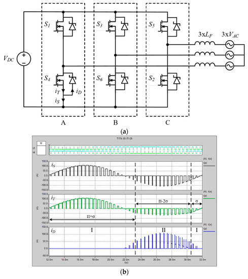 In contrast to low-voltage applications, medium-voltage SiC power devices operate only inside isolated power modules [1,3,4,5,6]—usually in half-bridge configuration [33,34,35]. Such a module can be a part of an isolated or non-isolated DC–DC converter, however, the most common application is a three-phase inverter composed of three pieces—see Figure 1a. For the sake of simplicity, let us consider a general case when the inverter is supplied from DC voltage source VDC and connected to three-phase inductive load (3 × LF) also including three-phase AC voltage sources (3 × VAC). Energy may be transferred in both directions and the power factor may vary between −1 (rectifier mode) and 1 (inverter mode) by means of AC current control. However, while the more complex control issues are out of the scope of this paper, due to the focus on the methods’ simplicity, a straightforward carrier-based sinusoidal PWM (pulse width modulation) method was assumed and expected to result in balanced AC currents at three-phase outputs. Under such circumstances, all six switches operate under identical conditions by means of switching and conduction losses and thus only one—the lower switch from phase A (S4 in Figure 1a)—is the subject of further consideration. To illustrate the performance the control signals and waveforms of currents in the switch (iS), the transistor (iT) and the diode (iD) are presented in Figure 1b for a power factor near unity.