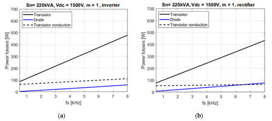 Power losses vs. switching frequency for inverter mode (a) and rectifier mode (b)—an estimation for a 220 kVA inverter.