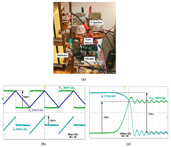 The analysis and simulations presented in previous section were verified by means of a series of advanced experiments including electrical and thermal measurements. The half-bridge circuit based on 3.3 kV/450 A SiC MOSFET modules from Hitachi (MSM450FS33A) equipped with self-made gate drivers with output voltage levels at +15/−9 V and supplementary protection circuits. The rest of the power circuit consists of 10 × 150 µF capacitors in the voltage divider and three reconfigurable 112 µH/500 A inductors acting as a passive load. Example of waveforms observed during an operation at 900 V and switching frequency fSH = 7 kHz can be seen in Figure 6b, while specific waveforms of the transistor turn-off process are shown in Figure 6c.