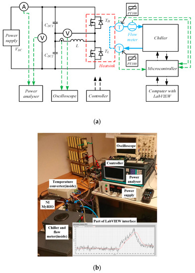 The scheme and photo of the test setup is presented in Figure 7. In addition to the half-bridge circuit monitored by a high-precision power meter and digital oscilloscope, the substantial component is a setup monitoring temperature and flow of the coolant delivered to the heatsink by the chiller maintaining a constant liquid temperature in its buffer tank (+/− 0.5 °C). Power loss calculation is conducted by microcontroller NI MyRIO-1900 controlling the chiller and collecting data from the temperature converters and the flow meter. A preview of the circuit parameters along with the possibility to control the measurement process is possible via a PC with LabVIEW software (Figure 7b).