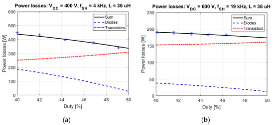 After checking different operating points, the procedure described above was used to verify the characteristics of the power losses versus duty ratio D’. Other parameters (VDC, L and fSH) were set as constant. It is noteworthy that this parameter shows slight influence on the total amount of power losses. Nevertheless, it will also decide about the split between diode and transistor. To illustrate this issue, a series of calculations using the procedure presented in Figure 2 was conducted in MATLAB for an exemplary case (VDC = 400 and 600 V, L = 36 μH, and fSH = 4 and 19 kHz)—see Figure 8. As expected, the decrease in the duty ratio D’ leads to an increased current in the diode and elevated losses, and at the same time losses in MOSFETs slightly drop. The results of experiments presented in Figure 8 and in Table 1 are consistent with advanced electro-thermal calculations. Operating points were chosen to test the different values of voltage, inductance and switching frequency, as well as different power levels. For all cases, the total measured losses change with the duty ratio and the maximum relative error (maxδP) was found to be below 4%. This means that the proposed method shows very good precision and can be implemented in validation of the power modules at requested power levels including an accurate split of power losses between the transistors and diodes.