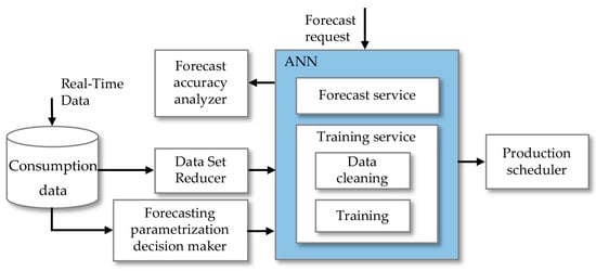 In this section, the proposed methodology is described step by step. These are split in parametrization and dataset reducer, training service, forecasting service, and forecast accuracy analyzer. The set of steps is integrated in several machine learning tasks, which include the extraction and reduce of data, the analysis of the best algorithm application, the cleaning of data, and the scheduled forecasts. Considering the existing real-time data, a sample representing consumption data is sent initially to trigger activities known as the dataset reducer and the forecasting parametrization decision maker that intends, respectively, to perform data selections and parametrization decisions with the goal of providing more accurate forecasts. The resulted data from these two activities are sent to the training service where the data cleaning activity intends to perform operations resulting in more reliable data. Still, in the training service, the training activity makes data adjustable and prepared for forecasting tasks. The forecasting service uses the prepared data to perform the intended forecasting tasks with the Artificial Neural Networks (ANN) algorithm. The proposed methodology diagram is presented in Figure 1.