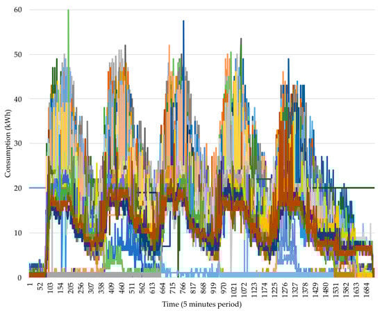The data are originally very inconsistent, presenting a lot information out of the 5-min context, leading to an uninterpretable analysis. Furthermore, the visualized outliers in the dataset are very distant from the remaining data, leading to very unrealistic scenarios. Hence, the raw data visualization provides low insights. The outlier removal clearly reduces the unrealistic consumptions allowing a more careful analysis of the consumption variability in the entire set. The time adjustment, aggregation, adding of missing records, and removal of unreliable weeks and Sundays lead to very consistent week patterns.