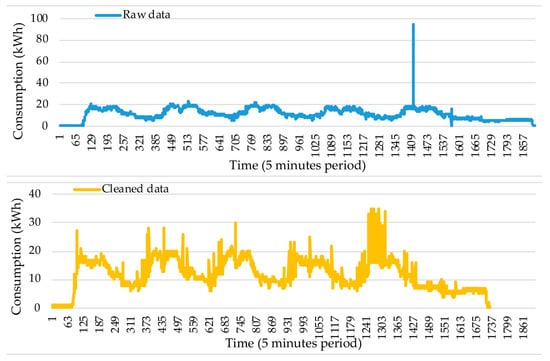 During the whole process, consumption tends to increase and to decrease a lot. Sequential weeks follow a very similar consumption variability. While following a similar week pattern during the entire time, it is clear that there are times with lower and higher activity. In early 2018, the consumption clearly shows a significant amount of energy consumption, namely, 50 kWh. This at some point decreased to 40 kWh. The impact of outlier removal is further researched in the test set measured from 8 to 13 April 2019. The raw and cleaned versions of data can be visualized for the period 8 to 13 April 2019, respectively, in Figure 5 top and bottom. The test data originally provide good insights about the consumption behavior during the whole time. The presence of a visible outlier in the raw version of the data reduces the interpretability of data.