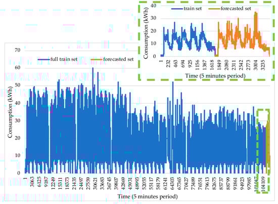 In Figure 6, the graph on the dashed green line is the detail of the region selected in the main graph by the green dashed box. The pattern start is featured by activity below 3 kWh, followed by industrial activity that is usually between 16 and the 25 kWh, possibly with some industrial activity exceptions with behavior above 25 kWh and below 40 kWh. The usual pattern featuring 16 to 25 kWh is followed by a period of low activity between 5 and 10 kWh. This is a daily pattern, with 288 observations that is repeated five times, one for each day of the week, specifically Monday to Friday. Moreover, a different daily pattern is present for Saturday, which also featured 288 observations, where the industrial consumption stays below 15 kWh, followed by the end of the week, which keeps the consumption below 3 kWh. The redundant daily pattern from Monday to Friday with 288 observations plus the Saturday pattern with 288 observations reflects a weekly pattern of 1728 observation.